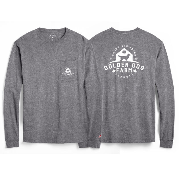 If you've watched our videos on instagram (@goldendogfarmvt), you'll recognize this as the shirt that Doug never seems to take off. First, because it comes in purple. Second, because it is super comfortable, even when you are doing some manly farmer stuff you've never attempted before. Be like Doug, try something new and get yourself a First Edition 100% Cotton Golden Dog long-sleeve pocket t-shirt (from League Legacy). Unisex sizes S-2XL.