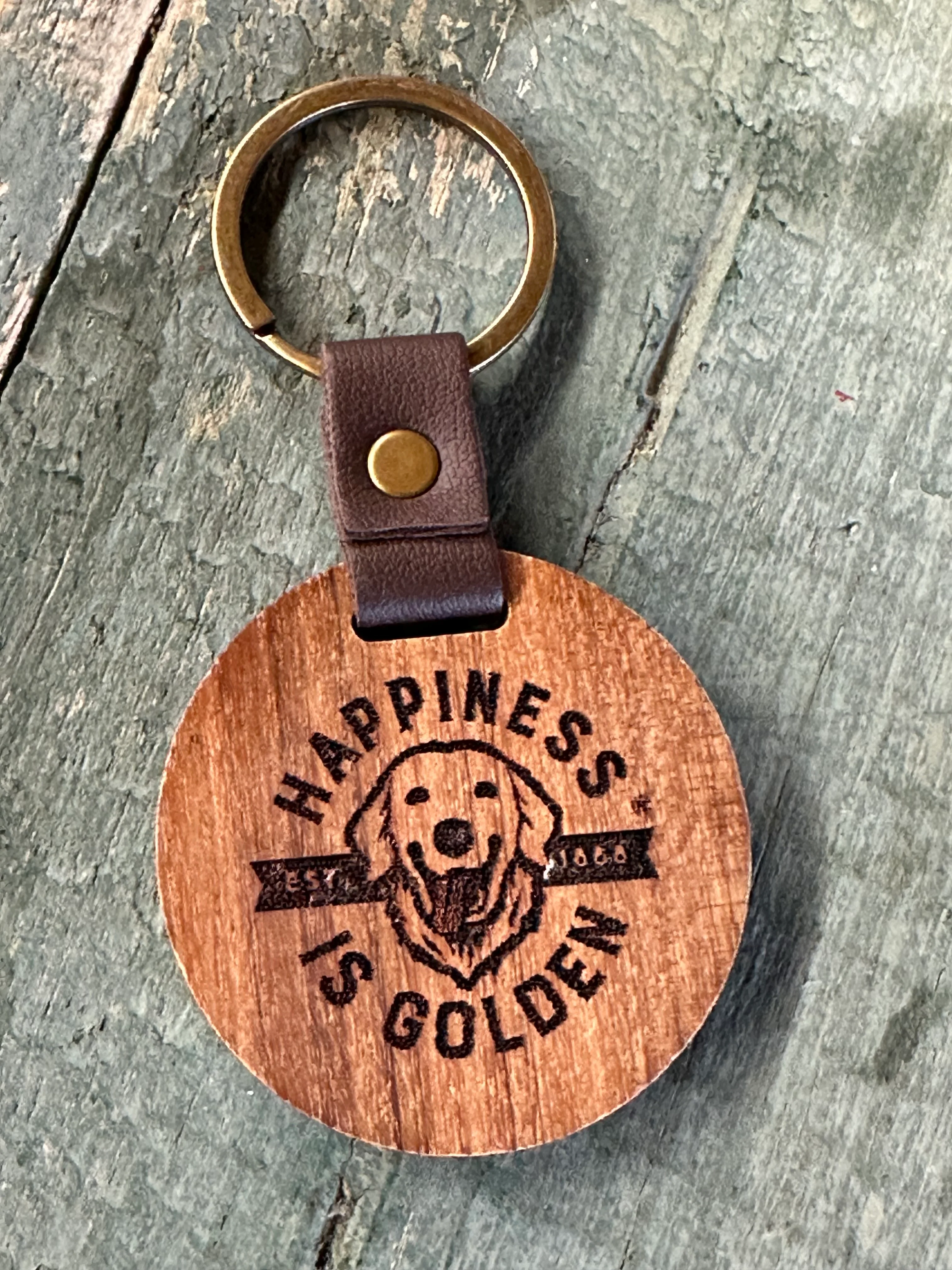 A beautiful wooden 1" diameter Happiness is Golden Keychain with a leather strap.